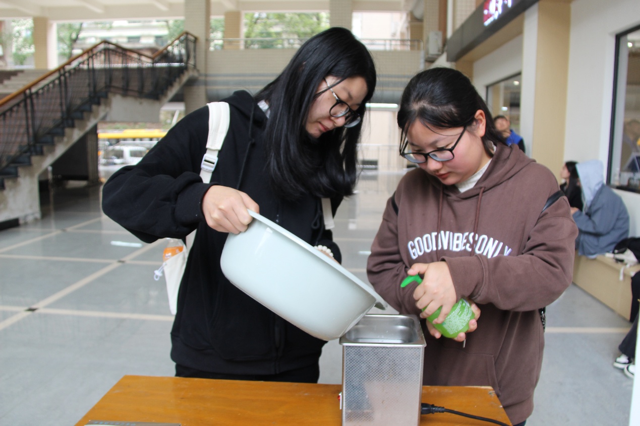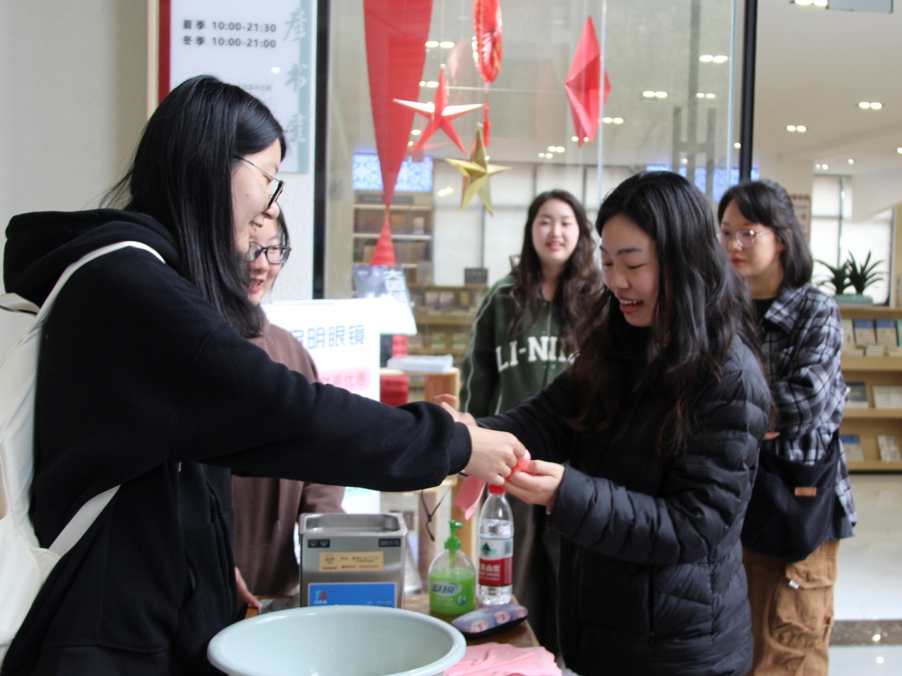 上午九点,义务洗眼镜活动准时开始,现场布置得井井有条。志愿者面带微笑,热情迎接前来的同学,小心接过眼镜后,便开始熟练地清洗。他们把眼镜浸入清洗液,轻轻地揉搓出细密泡沫,去除顽固污渍,接着用清水冲洗,再用擦拭布吸干水分,最后将洁净的眼镜归还同学。