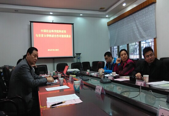 本网讯(娟萍) 10月29日下午,中国社科院科研局副局长陈文学率科研合作处处长孙晶、项目管理处处长金朝霞、成果与出版管理处处长薛增朝、期刊与年鉴管理处副处长赵普一行5人莅临我校洽谈科研合作,校党委书记游俊、校长白晋湘率相关职能部门和相关文科学院负责人在校办二会议室接待来宾,双方就科研合作对接等事宜举行了座谈交流。白晋湘校长主持会议。