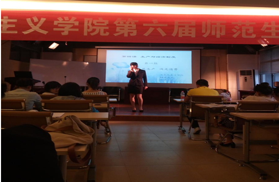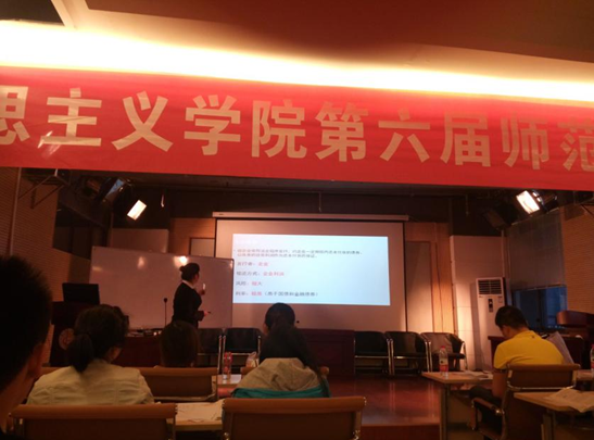 我院本次师范生技能大赛之讲课和即兴演讲的决赛有2014级和2013级共十位选手。由刘继富、孙忠良两位老师应邀担任评委。主持人王湘平。本次比赛分为两部分即兴演讲和片段教学,每位选手的总用时不得超过20分钟。主持人介绍本次比赛的流程规则后,十位选手按抽签顺序上台演讲和讲课。