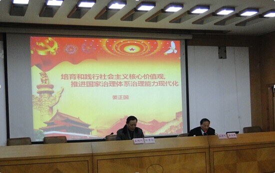 姜教授讲学内容紧扣我校分论坛主题,以“培育和践行社会主义核心价值观,推进国家治理体系治理能力现代化”为主线,从历史与现实、理论与实践结合上,深入阐释了培育和践行社会主义核心价值观与推进国家治理体系治理能力现代化的内涵、相互关系,深刻回答了推进国家治理体系和治理能力现代化必须解决好制度模式选择、价值体系建设等重大问题。姜教授讲学视野广阔、思想深刻,政治性、理论性、指导性强,是对我校大学生学习践行社会主义核心价值观的一次有力动员,有利于进一步拓宽我校师生的视野宽度,提高大学生思想政治素质。