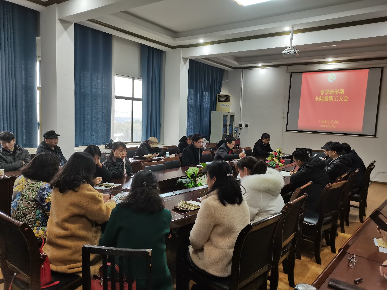 2月28日上午,学院在院会议室召开2021年新学期开学全体教职工大会。会议由学院党委副书记柴绪亮主持,吉首校区全体在岗教职工参加会议。柴绪亮首先传达了学校新学期中层干部会议的有关精神,通报了学院的有关人事工作安排。主持行政工作的副院长肖映胜结合学院《2021党政工作要点》部署安排了2021年的重点工作,畅谈了全年的工作思路与工作要求。与会人员还签订了安全工作责任书、党风廉政建设责任书。柴绪亮在总结会议时提出,全体师生员工要进一步提高思想认识,奋力干事创事业,落实工作责任,以优异成绩谱写学院发展的新篇章。
