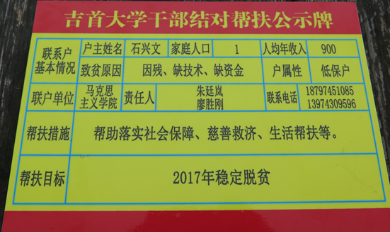 10月28日,学校党委书记游俊带领全校各部门到矮寨镇联团村完成了与贫困户的首次对接工作。学校各部门深入对接农户家中实地查看,做到“五个清楚”:家庭情况清楚,包括人员构成、劳动力等情况;致贫原因清楚;家庭的主要收入来源清楚;脱贫项目或打算清楚;联系方式清楚。自学校开展精准扶贫结对帮扶工作以来,我院高度重视,周密策划,迅速行动,调动全院教师的扶贫积极性,以实际行动和关怀帮助矮寨镇联团村对口扶贫户脱贫致富。