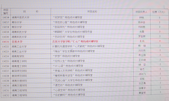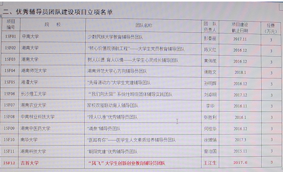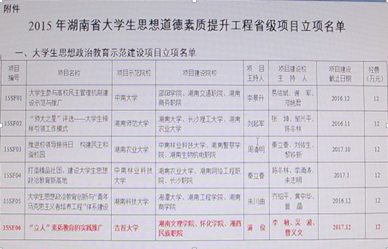 据悉,2015年大学生思想道德素质提升工程省级项目,经各校推荐,专家评选,省委教育工委、省教育厅审定,确定2015年度湖南省普通高校大学生思想政治教育示范建设项目立项项目15个,湖南省普通高校优秀辅导员团队立项建设项目50个, 湖南省普通高校特色成长辅导室立项建设项目98个,湖南省大学生德育实践项目246个。其中我校游俊书记主持《“立人”素质教育的实践推广》大学生思想政治教育示范建设项目(15SF06)、王江生主持的《英国官方365上市 “凤飞”大学生创新创业教育辅导员团队》优秀辅导员团队建设项目(15F12)、王元主持的《英国官方365上市医学院“仁心”特色成长辅导室》建设项目(15C21)、耿梓涵,谢正发主持的《隐形的翅膀――折翼天使关爱帮扶行动》等4个大学生德育实践项目获得立项。