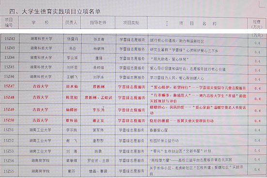本网讯(娟萍) 12月24日,湖南省教育工委发布了《关于2015年湖南省大学生思想道德素质提升工程省级项目立项的通知》(湘教工委通[2014]89号),我院3个大学生德育实践项目榜上有名。他们是:2014级研究生陈意如的《“行孝顺事,做感恩人”――地方高校大学生“孝感”道德实践现状与评价》(指导教师:廖胜刚、孟昭武)、2012级本科生田水仙的《“爱心陪护,希望同行”――学雷锋关爱留守儿童志愿服务》(指导教师:廖胜刚)、杨嫦好的《暖暖的心,满满的爱――“爱心家庭”温暖空巢老人传爱活动》(指导教师:李乐为)。