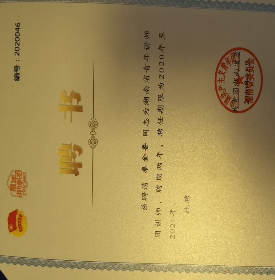 (图为共青团省委聘任廖金香为湖南省青年讲师团讲师的聘书)