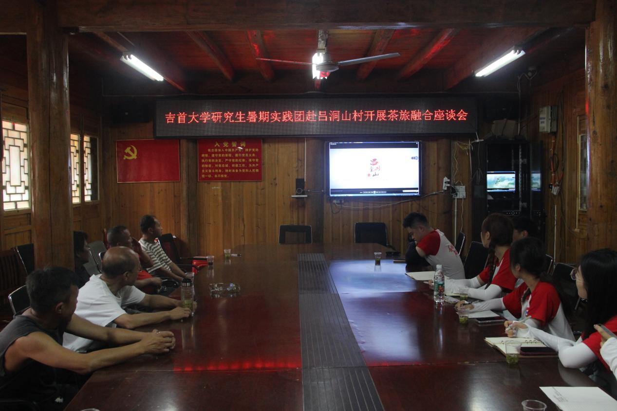 实践团在吕洞村举行了专题座谈会。会上,吕洞村驻村第一书记石峰对本次实践团的到来表示热烈欢迎,并就当前吕洞村基本情况作了详细介绍;团队负责人石惟仁向吕洞村村支两委及驻村工作队介绍了实践活动的基本情况,并殷切希望在实践过程中得到吕洞村村干部的支持与帮助。基本情况介绍完毕后,实践团成员就当前吕洞村茶旅融合发展的现状及困境向吕洞村村支两委提出一系列问题。