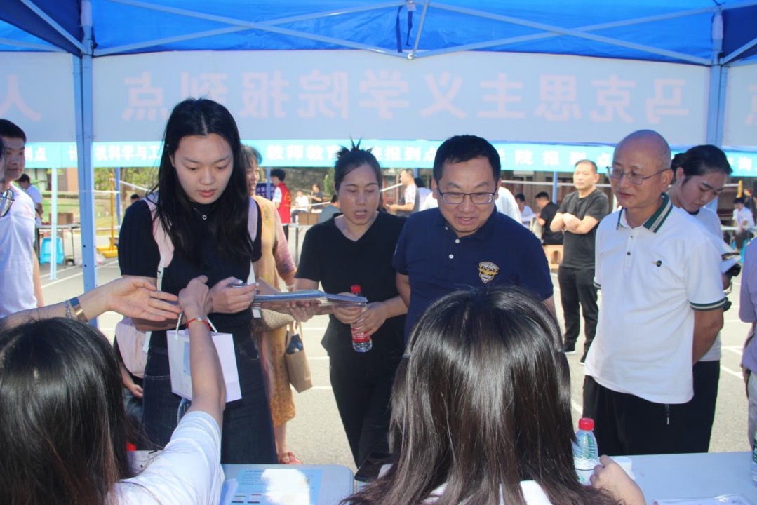 上午10 时许,学院领导也来到迎新现场,了解迎新工作的开展情况,关心慰问现场的师生志愿者,亲切问候报到的新生。