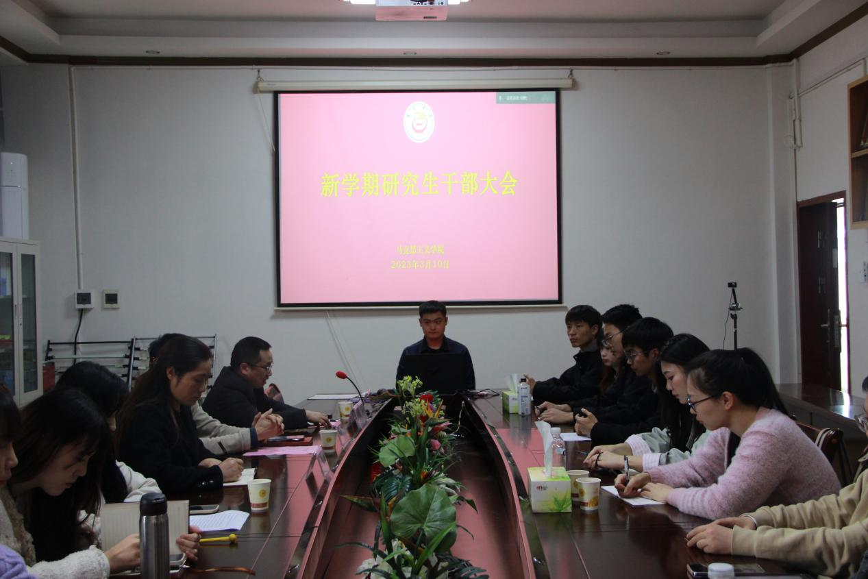 (通讯员 龚亭韵)本网讯:新学期伊始,为总结学院研会过去一年的工作经验,培养研究生干部的大局意识、责任意识和服务意识,提升其综合素质和工作能力。我院于2023年3月10日下午在一教六楼会议室召开了新学期研究生干部大会。学院党委书记柴绪亮主持了会议,院长肖映胜、研究生秘书欧阳静受邀出席了会议,全体研究生干部参加了会议。