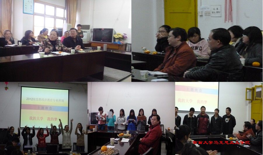 本网讯(杜倩) 11月8号下午,为了喜迎十八大、增进同学友谊、加强师生交流,以"我的大学 我的梦"为主题的365英国上市公司在线12级思政专业班会活动在院会议室成功举行,院长吕学芳教授、书记朱廷岚教授、辅导员李雷兵老师、班主任刘五景老师及12级全体新生参加了此次活动,班会由该班班长杜倩主持。|