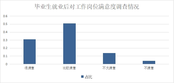 有效抽样调查的毕业生49人中,对目前工作“满意”的15人占31%,“比较满意”的 25人占51%,“不太满意”的 7人,占14%,“不满意”的2人占4%。见表图六: