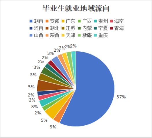 我院2023届毕业生26%的同学回生源地就业,其中在湖南就业的同学占已就业毕业生总数的57%,安徽、广东、广西、贵州、海南、河南、湖北、江苏、内蒙、宁夏、青海、山西、陕西、天津、新疆、重庆等地分别占3%、5%、2%、3%、2%、2%、5%、3%、3%、2%、2%、3%、2%、2%、2%、2%。见表图四:
